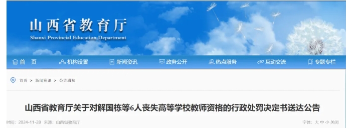 依據(jù)《中華人民共和國(guó)教師法》第十四條、《教師資格條例》第十八條、《〈教師資格條例〉實(shí)施辦法》第二十五條相關(guān)規(guī)定,山西省教育廳對(duì)解國(guó)棟等6人已作出喪失教師資格的行政處罰,解國(guó)棟等6人經(jīng)采取直接送達(dá)、委托送達(dá)等方式均無(wú)法送達(dá)行政處罰決定書(shū),現(xiàn)依法公告送達(dá),解國(guó)棟等6人公告信息如下。