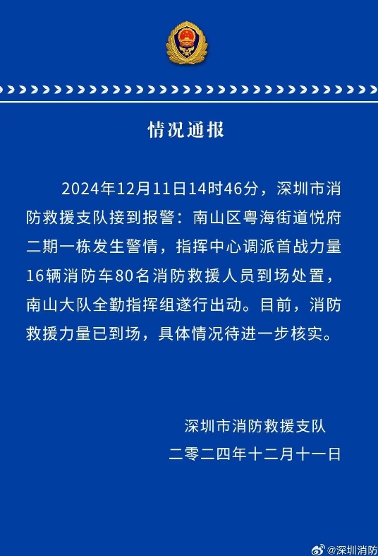 2024年12月11日14時46分,深圳市消防救援支隊接到報警:南山區(qū)粵海街道悅府二期一棟發(fā)生警情,指揮中心調(diào)派首戰(zhàn)力量16輛消防車80名消防救援人員到場處置,南山大隊全勤指揮組遂行出動。目前,消防救援力量已到場,具體情況待進一步核實。