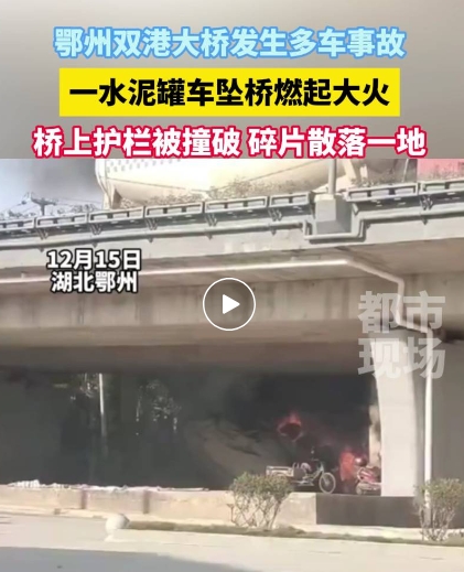 視頻顯示,目擊者駕車行駛過程中,黑煙裹挾著火光不斷升起。橋面有多車??恳贿?,橋上護欄被撞破,碎片散落一地。另一畫面中,一水泥罐車墜落橋底,消防救援人員已趕到現(xiàn)場進行滅火。