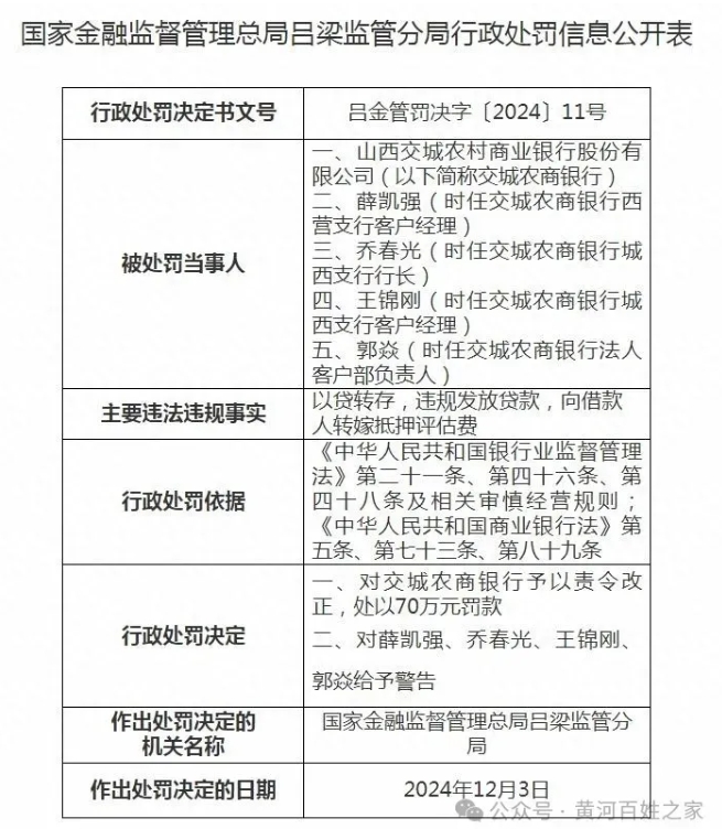 近日,據(jù)國家金融監(jiān)督管理總局呂梁監(jiān)管分局行政處罰信息公開表(呂金管罰決字〔2024〕11號)顯示,山西交城農(nóng)村商業(yè)銀行股份有限公司(以下簡稱交城農(nóng)商銀行)因以貸轉(zhuǎn)存、違規(guī)發(fā)放貸款、向借款人轉(zhuǎn)嫁抵押評估費(fèi)等被行政處罰依據(jù)《中華人民共和國銀行業(yè)監(jiān)督管理法》第二十一條、第四十六條、第四十八條及相關(guān)審慎經(jīng)營規(guī)則;《中華人民共和國商業(yè)銀行法》第五條、第七十三條、第八十九條,行政處罰決定 :對交城農(nóng)商銀行予以責(zé)令改正,處以70萬元罰款。