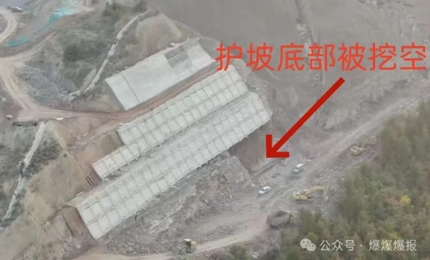 據(jù)知情人透露,按正常施工流程,護坡的框架梁應該由下向上逐層施工。但該工程卻在已經(jīng)澆筑完好幾層框架梁的底部再填充一層框架梁。之所以要在底部填充一層,是因為護坡底部的基層墊石已被施工方挖空,上面的護坡也已出現(xiàn)裂縫,所以施工方要在底部填充一層予以加固。