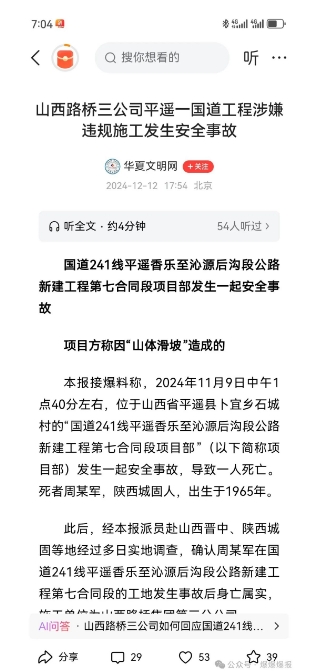 據(jù)該工程項目部一工作人員向本報反饋,周某軍的確是在該項目部的工地發(fā)生事故死亡,事故原因是因為山體滑坡造成的。事故發(fā)生后,平遙縣政府也成立了由縣公安、應急等部門組成的聯(lián)合調查組。