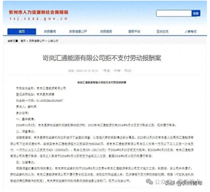 2024年10月8日,岢嵐縣勞動(dòng)監(jiān)察機(jī)構(gòu)接到群體投訴稱,2023年與匯通能源協(xié)商2024年6月25日支付剩余工資,現(xiàn)未履行承諾。