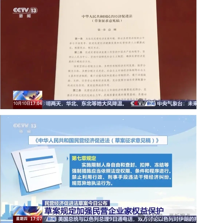在10月14日的一場新聞發(fā)布會上,司法部副部長胡衛(wèi)列說,草案第一次將“兩個毫不動搖”“培育和弘揚企業(yè)家精神”等寫入法律,并明確“促進民營經(jīng)濟持續(xù)、健康、高質(zhì)量發(fā)展,是國家長期堅持的重大方針政策”,這充分表明促進民營經(jīng)濟發(fā)展是黨和國家一以貫之并將長期堅持的大政方針。