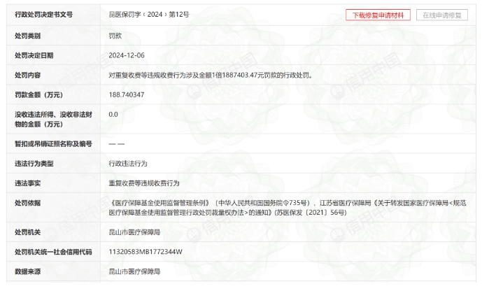 據(jù)信用中國官方網(wǎng)站,近日,江蘇昆山虹橋醫(yī)院有限公司因重復(fù)收費等違規(guī)收費行為,被昆山市醫(yī)療保障局罰款188萬余元。此前,該醫(yī)院曾因診療活動未嚴(yán)格遵守診療相關(guān)規(guī)范、常規(guī)等行政違法行為被罰。