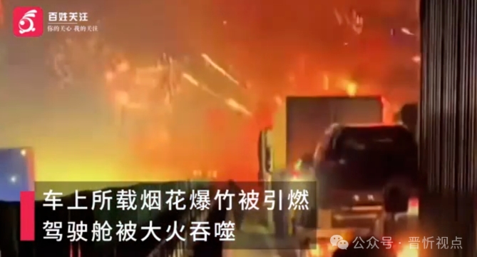 運(yùn)載爆竹貨車高速起火煙花四射,駕駛艙被大火吞噬12月23日,河北秦皇島京哈高速盧龍縣雙望鎮(zhèn)附近路段發(fā)生驚險(xiǎn)一幕,一輛運(yùn)載煙花的貨車起火,車上煙花爆竹瞬間被引燃,駕駛艙被熊熊大火吞噬,現(xiàn)場情況十分危急。24日,記者從盧龍縣消防隊(duì)了解到,事發(fā)后,消防隊(duì)已趕赴現(xiàn)場搶險(xiǎn)。據(jù)悉,此次火情是一起交通事故引起的,沒有造成人員傷亡。