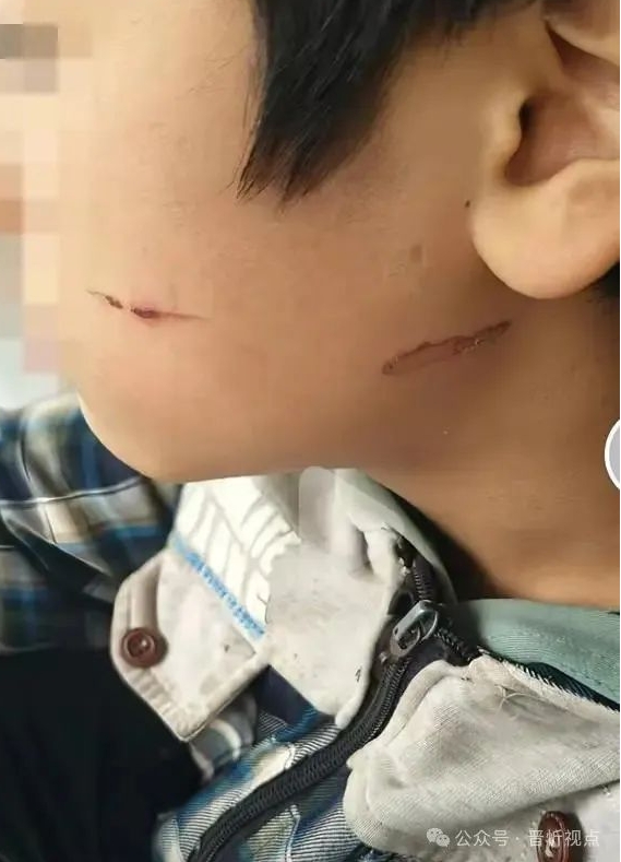 視頻圖片顯示,被打男生左臉和左耳下端各有一條明顯的疤痕