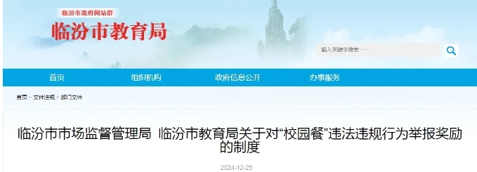 為進一步加強校園食品安全監(jiān)管,鼓勵社會公眾主動參與社會監(jiān)督,進一步發(fā)揮社會共治作用,及時發(fā)現(xiàn)和有效控制“校園餐”食品安全風(fēng)險隱患,根據(jù)《市場監(jiān)管總局辦公廳關(guān)于鼓勵開展“校園餐”舉報獎勵工作的通知》(市監(jiān)餐飲發(fā)〔2024〕89號),現(xiàn)就學(xué)生食堂、承包經(jīng)營企業(yè)、校外供餐單位、食材供應(yīng)企業(yè)等“校園餐”違法違規(guī)行為舉報獎勵有關(guān)事項制度如下:
