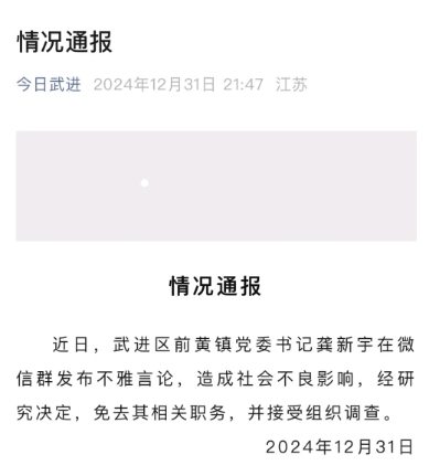 2024年12月31日,江蘇常州市武進(jìn)區(qū)前黃鎮(zhèn)一黨委書(shū)記被曝將不雅聊天內(nèi)容誤發(fā)到工作群,引發(fā)關(guān)注。對(duì)此,“今日武進(jìn)”連夜發(fā)布情況通報(bào)稱(chēng),免去其相關(guān)職務(wù),并接受組織調(diào)查。原文如下: