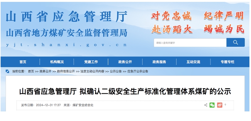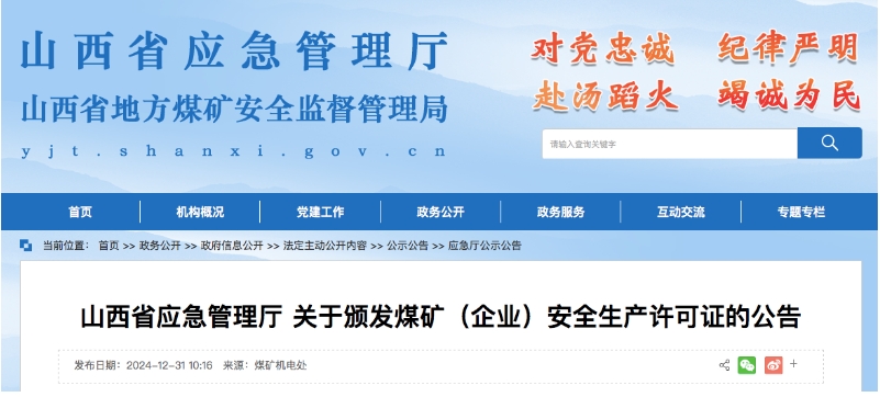 山西省應(yīng)急管理廳關(guān)于頒發(fā)煤礦(企業(yè))安全生產(chǎn)許可證的公告經(jīng)研究,按照有關(guān)規(guī)定,為山西樓俊集團趙家莊煤業(yè)有限公司等 2 座煤礦(企業(yè))頒發(fā)安全生產(chǎn)許可證,現(xiàn)進行公告。公告期:2025 年 1 月 1 日至 2025 年 1 月 8 日。