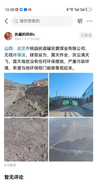 山西古交市桃園街道耀安嘉煤業(yè)有限公司,無視環(huán)保法i,肆意妄為,露天作業(yè),灰塵滿天飛,露天堆放沒有任何環(huán)保措施,嚴(yán)重污染環(huán)境,希望當(dāng)?shù)丨h(huán)保部門能夠重視起來。