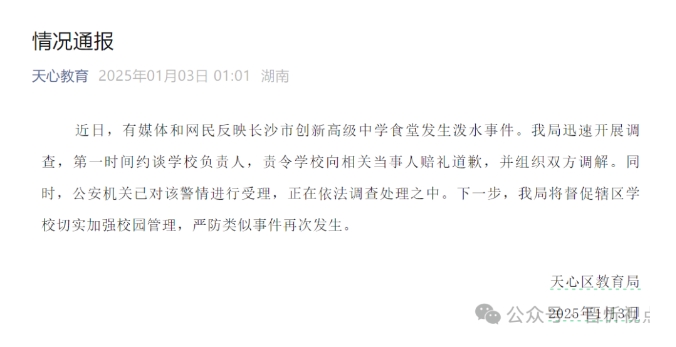 對(duì)此,長(zhǎng)沙市天心區(qū)教育局1月3日發(fā)布情況通報(bào)稱(chēng),該局迅速開(kāi)展調(diào)查,第一時(shí)間約談學(xué)校負(fù)責(zé)人,責(zé)令學(xué)校向相關(guān)當(dāng)事人賠禮道歉,并組織雙方調(diào)解。