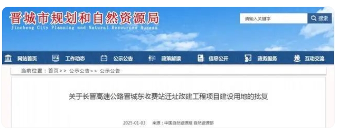 1月3日,晉城市規(guī)劃和自然資源局發(fā)布關(guān)于長晉高速公路晉城東收費站遷址改建工程項目建設(shè)用地的批復(fù)。