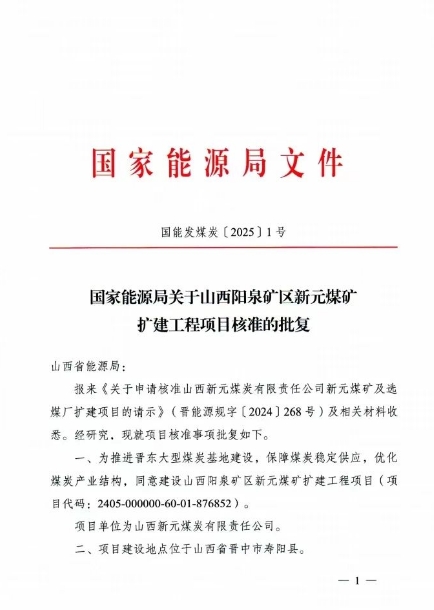 山西省能源局:報(bào)來(lái)《關(guān)于申請(qǐng)核準(zhǔn)山西新元煤炭有限責(zé)任公司新元煤礦及選煤廠擴(kuò)建項(xiàng)目的請(qǐng)示》(晉能源規(guī)字〔2024】268號(hào))及相關(guān)材料收悉。經(jīng)研究,現(xiàn)就項(xiàng)目核準(zhǔn)事項(xiàng)批復(fù)如下。