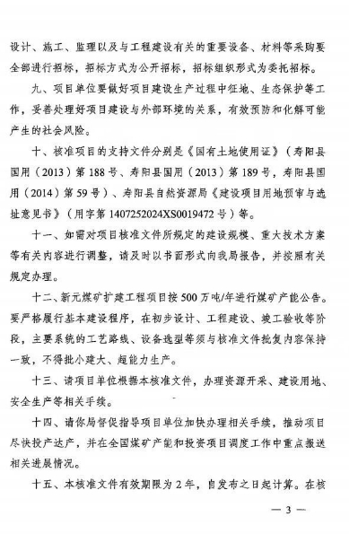 一、為推進(jìn)晉東大型煤炭基地建設(shè),保障煤炭穩(wěn)定供應(yīng),優(yōu)化煤炭產(chǎn)業(yè)結(jié)構(gòu),同意建設(shè)山西陽(yáng)泉礦區(qū)新元煤礦擴(kuò)建工程項(xiàng)目(項(xiàng)目代碼:2405-000000-60-01-876852)。項(xiàng)目單位為山西新元煤炭有限責(zé)任公司。