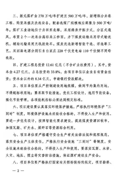 四、擴(kuò)建工程總投資 12.61 億元(不含礦業(yè)權(quán)費(fèi)用),其中,資本金 4.27 億元,占總投資的 33.8%,由項(xiàng)目單位以企業(yè)自有資金出資;資本金以外的 8.34 億元,申請(qǐng)銀行貸款解決。五、項(xiàng)目單位要從嚴(yán)控制建設(shè)用地規(guī)模,做到節(jié)約集約用地,不得超標(biāo)準(zhǔn)用地;要采取節(jié)能措施,優(yōu)化工程設(shè)計(jì),選用節(jié)能設(shè)備,強(qiáng)化節(jié)能管理,各項(xiàng)能耗指標(biāo)必須達(dá)到規(guī)定標(biāo)準(zhǔn)。