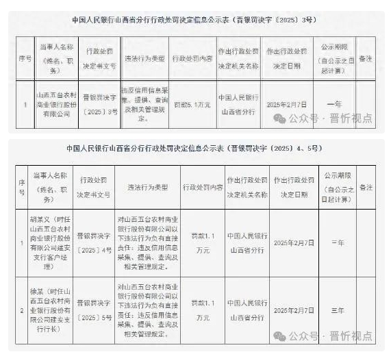2月13日金融資訊,根據(jù)中國人民銀行山西省分行行政處罰公示,山西五臺農(nóng)村商業(yè)銀行股份有限公司因在信用信息采集、提供、查詢等環(huán)節(jié)違規(guī)操作,被處以51,000元人民幣的罰款。