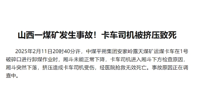2025年2月11日20時40分許,中煤平朔集團安家?guī)X露天煤礦運煤卡車在1號破碎口進行卸煤作業(yè)時,廂斗未能正常下降,卡車司機進入廂斗下方檢查原因,廂斗突然下落,擠壓造成卡車司機受傷,經(jīng)醫(yī)院搶救無效死亡。事故原因正在調(diào)查中。