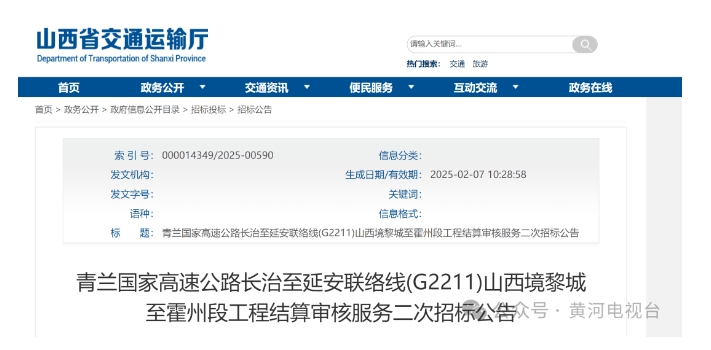 近日,山西省交通運輸廳發(fā)布青蘭國家高速公路長治至延安聯(lián)絡線(G2211)山西境黎城至霍州段工程結(jié)算審核服務二次招標公告。