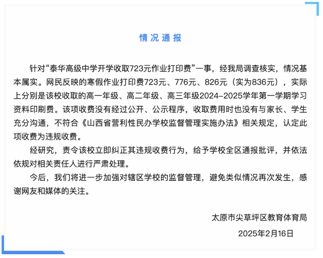 太原市泰華高級(jí)中學(xué)官方信息顯示,該校為全日制民辦寄宿制學(xué)校。學(xué)校為原衡水第一中學(xué)在省外舉辦的一所直營(yíng)學(xué)校,全面學(xué)習(xí)“衡水模式”。該校2022年曾發(fā)布聲明稱,“除正常學(xué)費(fèi)外,本校未收取任何其他費(fèi)用?!?