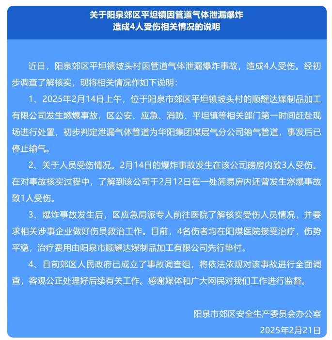 1、2025年2月14日上午,位于陽泉市郊區(qū)平坦鎮(zhèn)坡頭村的順耀達煤制品加工有限公司發(fā)生燃爆事故,區(qū)公安、應急、消防、平坦鎮(zhèn)等相關(guān)部門第一時間趕赴現(xiàn)場進行處置,初步判定泄漏氣體管道為華陽集團煤層氣分公司輸氣管道,事發(fā)后已停止輸氣。