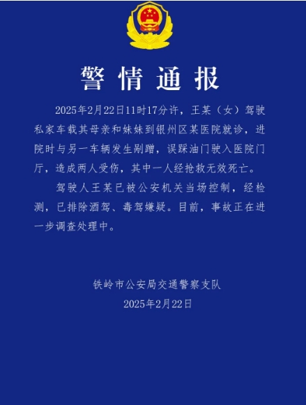 2月22日,鐵嶺市公安局交通警察支隊發(fā)布通報:2月22日11時17分許,王某(女)駕駛私家車載其母親和妹妹到銀州區(qū)某醫(yī)院就診,進院時與另一車輛發(fā)生剮蹭,誤踩油門駛入醫(yī)院門廳,造成兩人受傷,其中一人經搶救無效死亡。駕駛人王某已被公安機關當場控制,經檢測,已排除酒駕、毒駕嫌疑。目前,事故正在進一步調查處理中。