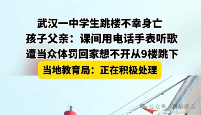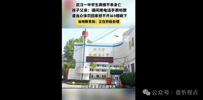 據(jù)黑龍江都市頻道“新聞夜航”2月22日消息,湖北武漢武珞路中學(xué)一學(xué)生在課間用電話手表聽歌被當(dāng)眾責(zé)罵,回家后跳樓身亡。
