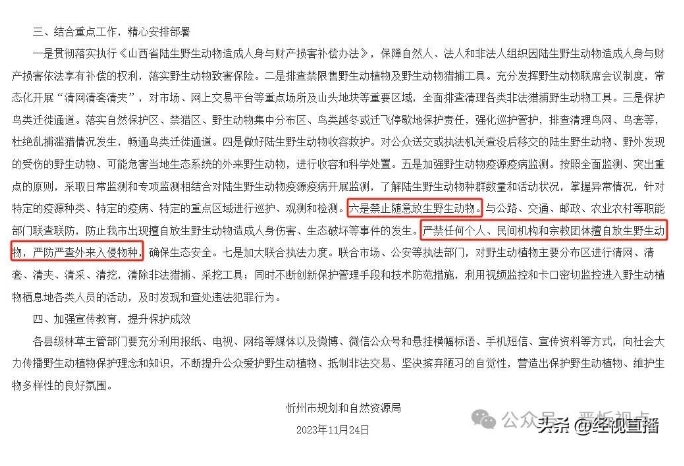 記者在一份《忻州市規(guī)劃和自然資源局關(guān)于進(jìn)一步加強野生動植物保護(hù)工作的通知》文件中看到,文中明確,嚴(yán)禁任何個人、民間機構(gòu)和宗教團(tuán)體擅自放生野生動物,嚴(yán)防嚴(yán)查外來入侵物種,確保生態(tài)安全。