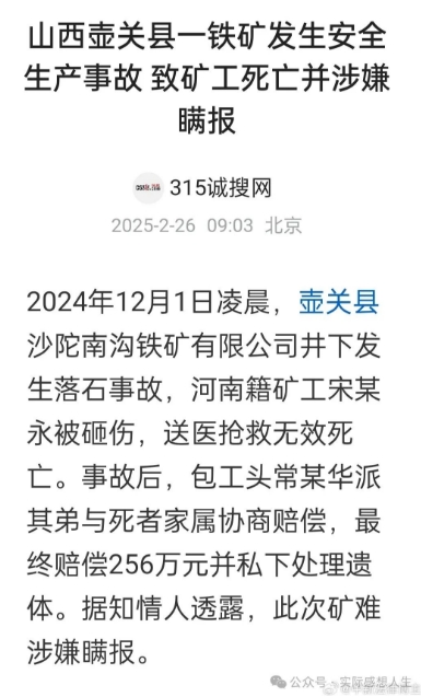 2024年12月1日凌晨,壺關(guān)縣沙陀南溝鐵礦有限公司井下發(fā)生落石事故,河南籍礦工宋某永被砸傷,送醫(yī)搶救無效死亡。事故后,包工頭常某華派其弟與死者家屬協(xié)商賠償,最終賠償256萬元并私下處理遺體。據(jù)知情人透露,此次礦難涉嫌瞞報。