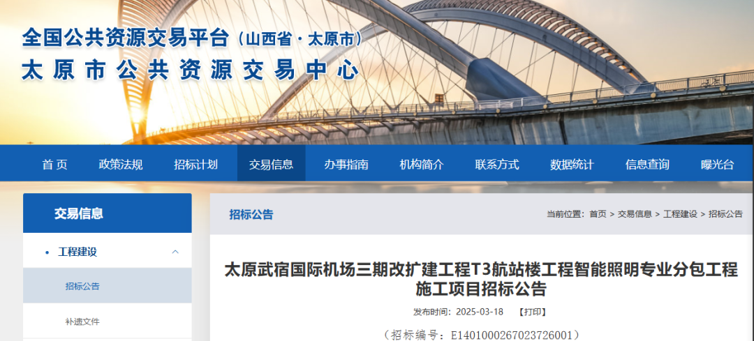 3月18日,山西省公共資源交易中心消息,太原武宿國(guó)際機(jī)場(chǎng)三期改擴(kuò)建工程T3航站樓工程智能照明專業(yè)分包工程施工項(xiàng)目招標(biāo)公告開始招標(biāo)。