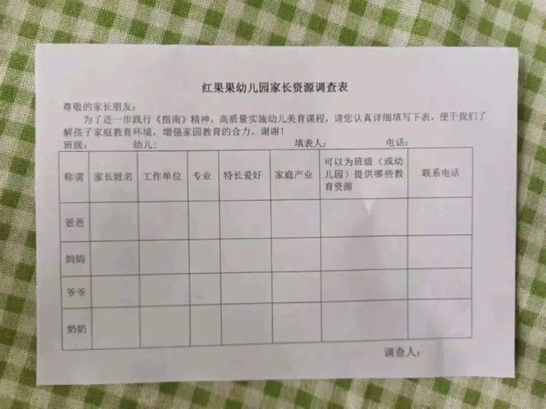 江蘇鹽城一幼兒園收集家長(zhǎng)資源,調(diào)查信息包括家長(zhǎng)的家庭產(chǎn)業(yè)、可以為幼兒園提供哪些教育資源等。據(jù)媒體報(bào)道,園方回應(yīng)稱是省級(jí)優(yōu)質(zhì)幼兒園復(fù)審需要,但這一說(shuō)法被當(dāng)?shù)亟逃址裾J(rèn)。