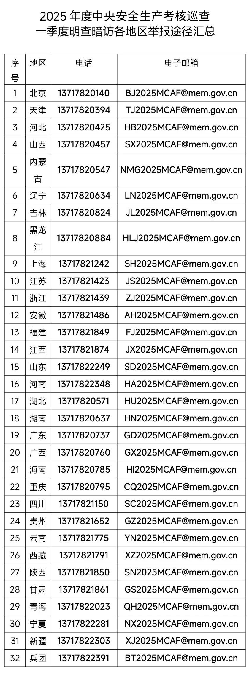 附件:2025 年度中央安全生產(chǎn)考核巡查一季度明查暗訪各地區(qū)舉報途徑匯總