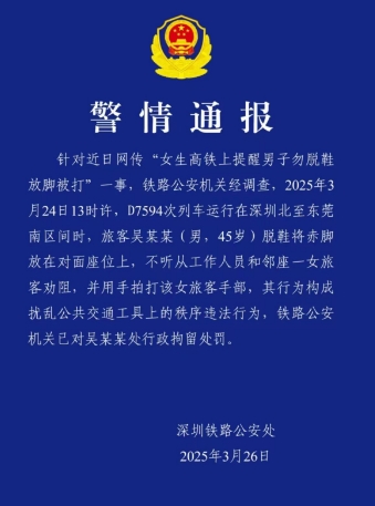 3月26日,@深圳鐵路公安處 發(fā)布警情通報(bào)稱,針對(duì)近日網(wǎng)傳“女生高鐵上提醒男子勿脫鞋放腳被打”一事,鐵路公安機(jī)關(guān)經(jīng)調(diào)查,2025年3月24日13時(shí)許,D7594次列車運(yùn)行在深圳北至東莞南區(qū)間時(shí),旅客吳某某(男,45歲)脫鞋將赤腳放在對(duì)面座位上,不聽從工作人員和鄰座一女旅客勸阻,并用手拍打該女旅客手部,其行為構(gòu)成擾亂公共交通工具上的秩序違法行為,鐵路公安機(jī)關(guān)已對(duì)吳某某處行政拘留處罰。