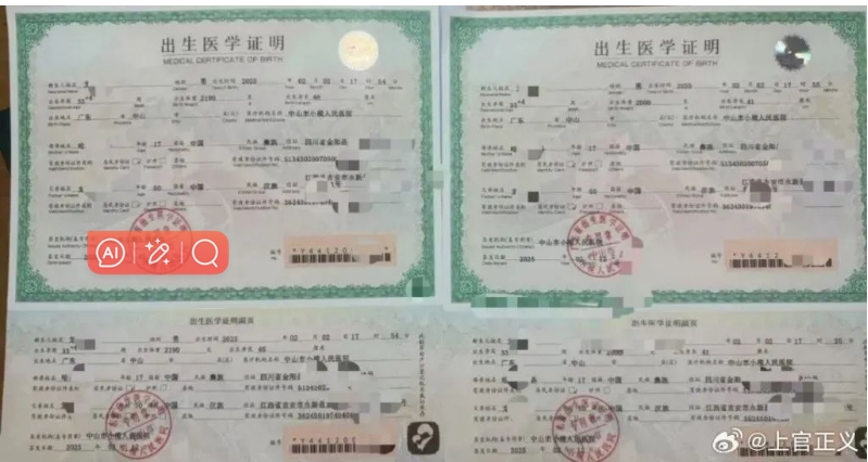 據(jù)此前上官正義公布的消息,他從廣州市一代孕機構(gòu)了解到,一名2007年5月出生的17歲女孩,為一名50歲的江西永新男子代孕,于今年2月2日在中山市小欖鎮(zhèn)產(chǎn)下雙胞胎。根據(jù)代孕機構(gòu)提供的出生證明顯示,新生兒信息為:龍某生,男,2025年2月2日17:55分在中山市小欖鎮(zhèn)人民醫(yī)院出生,出生證明簽發(fā)時間為2025年2月12日;母親信息為:哈某,年齡17歲,四川省金陽縣人,出生日期為2007年5月;父親為:龍某,年齡50歲,江西省永新縣人,出生日期為1974年4月。合同顯示,龍某某與廣州君蘭醫(yī)療設(shè)備有限公司簽訂供卵、代孕協(xié)議,代孕總價格為73萬元。上官正義還提供了出生證、代孕協(xié)議等相關(guān)圖片。
