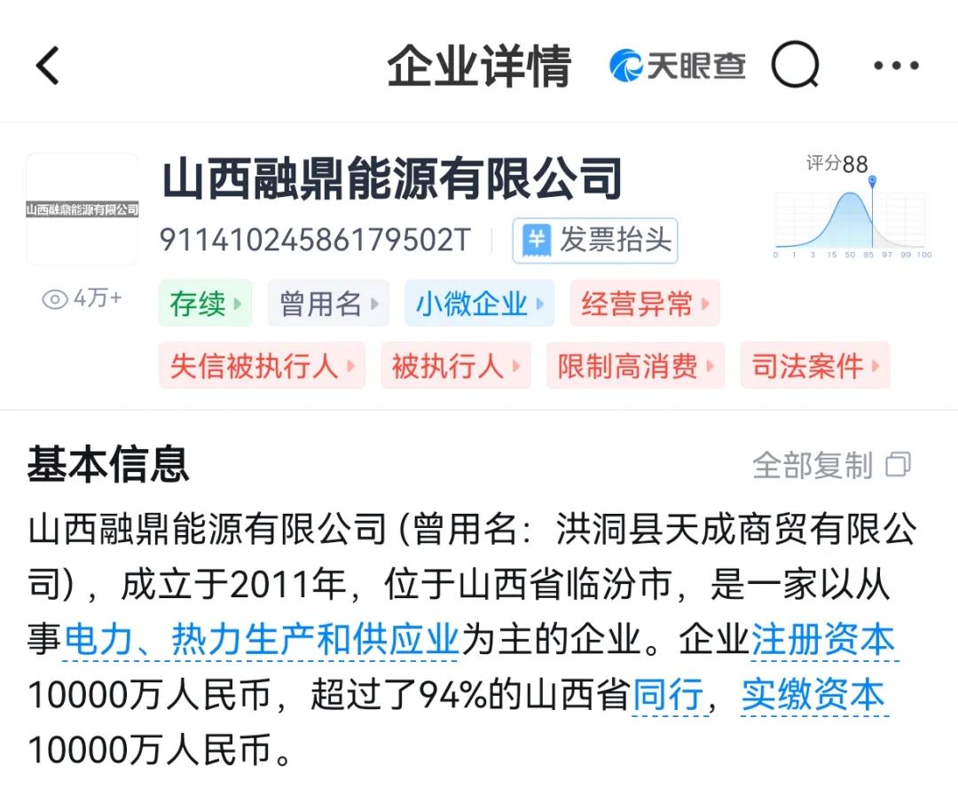 經(jīng)天眼查顯示,山西融鼎能源有限公司及洪洞縣康老洗煤有限公司目前均出現(xiàn)經(jīng)營異常,涉及司法訴訟案件,并且相關企業(yè)負責人等已經(jīng)被列為失信執(zhí)行人員,同時已被限高。