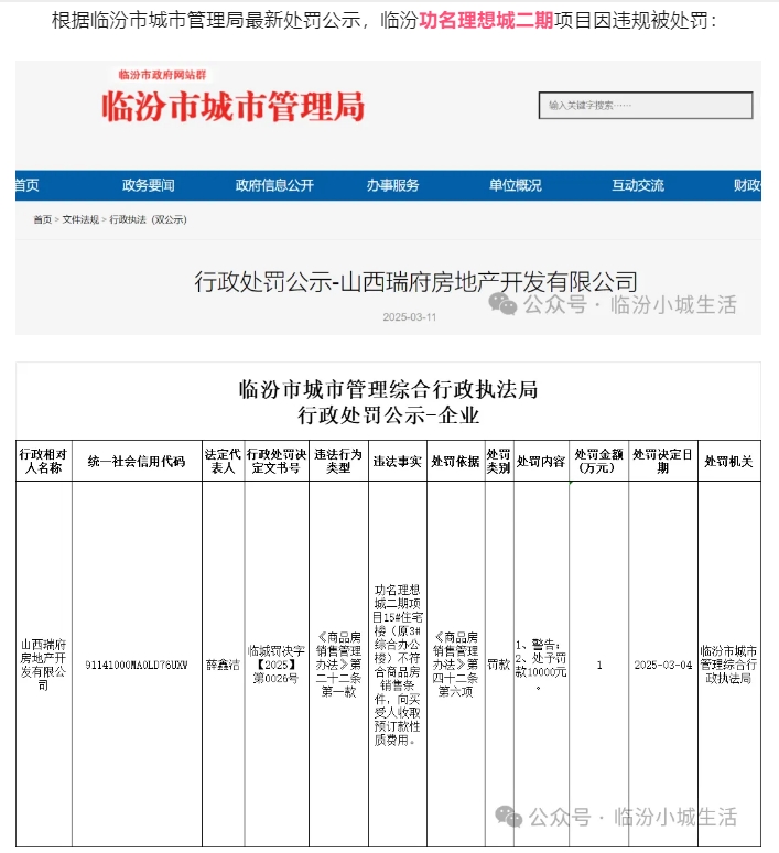 根據(jù)臨汾市城市管理局最新處罰公示,臨汾功名理想城二期項(xiàng)目因違規(guī)被處罰:
