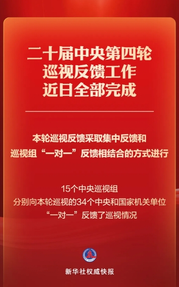 根據(jù)黨中央部署,二十屆中央第四輪巡視反饋工作近日全部完成。本輪巡視反饋采取集中反饋和巡視組“一對一”反饋相結(jié)合的方式進(jìn)行。