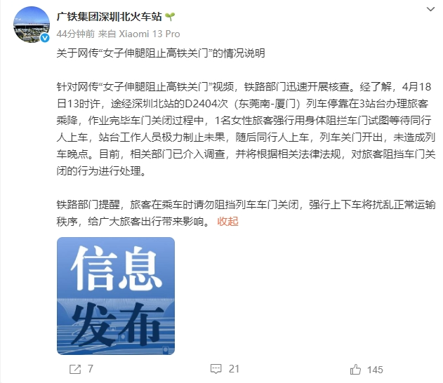 4月19日,廣鐵集團(tuán)深圳北火車站發(fā)布關(guān)于網(wǎng)傳“女子伸腿阻止高鐵關(guān)門”的情況說明。