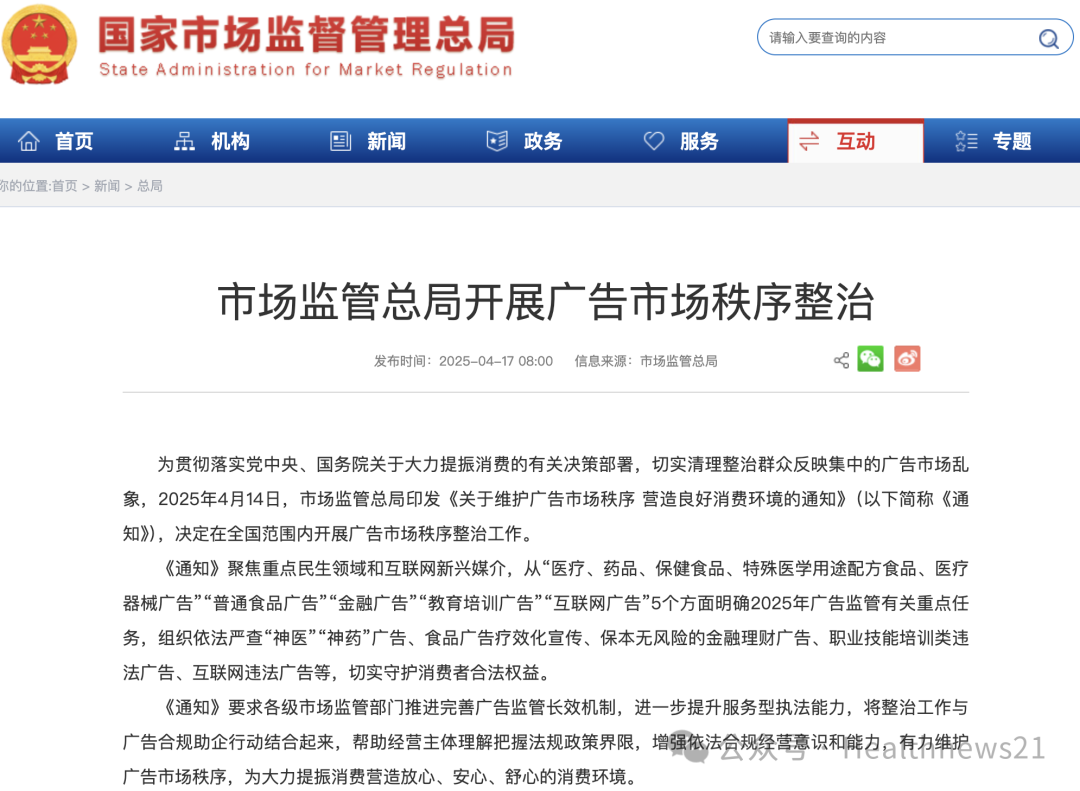 近日,國家市場監(jiān)管總局印發(fā)《關于維護廣告市場秩序營造良好消費環(huán)境的通知》(以下簡稱《通知》),將聚焦“醫(yī)療、藥品、保健食品、特殊醫(yī)學用途配方食品、醫(yī)療器械廣告”等5個方面,在全國范圍內(nèi)開展廣告市場秩序整治工作。