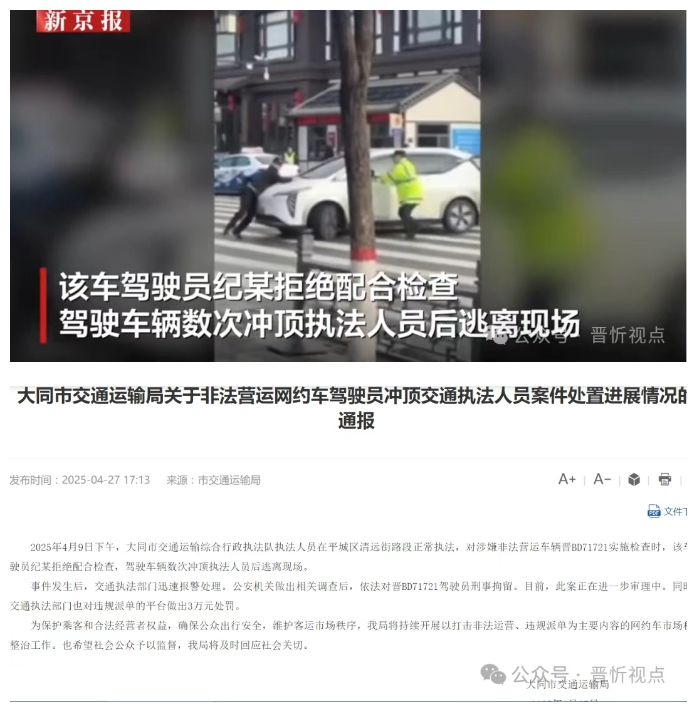 4月29日,記者從山西大同市交通局獲悉,非法營(yíng)運(yùn)網(wǎng)約車(chē)的駕駛員沖頂交通執(zhí)法人員被刑拘。4月9日,大同交通執(zhí)法部門(mén)在平城區(qū)對(duì)涉嫌非法營(yíng)運(yùn)車(chē)輛晉BD71721實(shí)施檢查,該車(chē)駕駛員紀(jì)某拒絕配合檢查,駕駛車(chē)輛數(shù)次沖頂執(zhí)法人員后逃離現(xiàn)場(chǎng)。經(jīng)當(dāng)?shù)鼐秸{(diào)查后,依法對(duì)晉BD71721駕駛員刑事拘留。同時(shí),交通執(zhí)法部門(mén)也對(duì)違規(guī)派單的平臺(tái)做出3萬(wàn)元處罰。