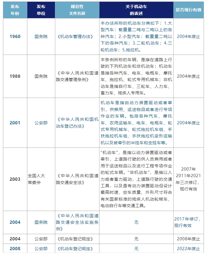 為進一步厘清我國法律對于機動車的規(guī)定脈絡,筆者對我國相關規(guī)范性文件梳理后發(fā)現(xiàn),在2003年我國道路交通安全法正式施行前,國務院、公安部出臺的行政法規(guī)、部門規(guī)章中已有關于機動車定義的條款,但主要是以列舉式或者概括式+列舉式為主,且將電車、電瓶車也納入機動車的范疇。而自2003年道路交通安全法采取概括式方法定義機動車,且將電動自行車歸入非機動車范疇后,國務院、公安部后續(xù)出臺或修訂的《中華人民共和國道路交通管理條例》《機動車登記規(guī)定》則不再對機動車的定義作單獨規(guī)定。(見表1)