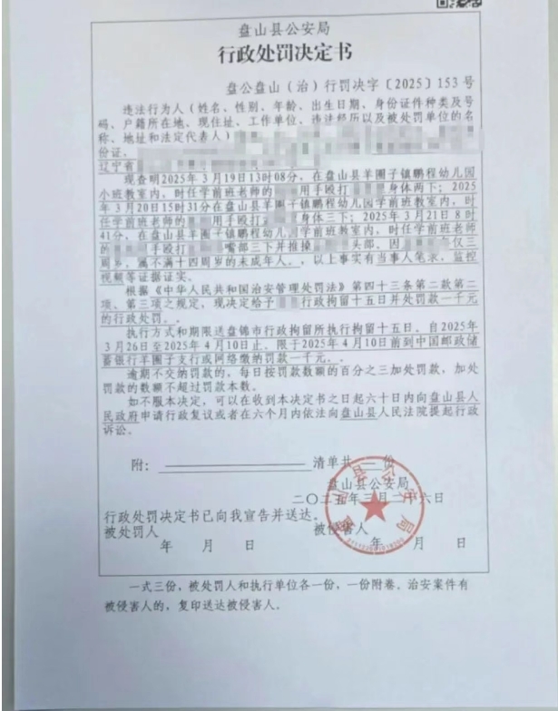孟先生提供的蓋有“盤山縣羊圈子派出所”公章的“立案告知書”顯示,“20250324幼兒園毆打他人案”已立案。