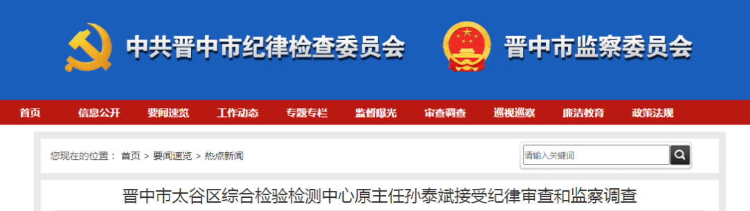 晉中市太谷區(qū)綜合檢驗檢測中心原主任孫泰斌接受紀(jì)律審查和監(jiān)察調(diào)查