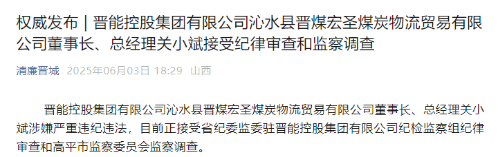 晉能控股集團有限公司沁水縣晉煤宏圣煤炭物流貿(mào)易有限公司董事長、總經(jīng)理關(guān)小斌涉嫌嚴(yán)重違紀(jì)違法,目前正接受省紀(jì)委監(jiān)委駐晉能控股集團有限公司紀(jì)檢監(jiān)察組紀(jì)律審查和高平市監(jiān)察委員會監(jiān)察調(diào)查。