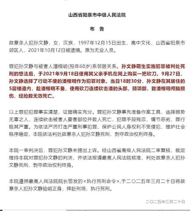 遵照最高人民法院院長簽發(fā)的(執(zhí)行死刑命令),于二〇二五年三月二十日將故意殺人犯孫文靜驗(yàn)明正身,押赴刑場(chǎng),執(zhí)行死刑。