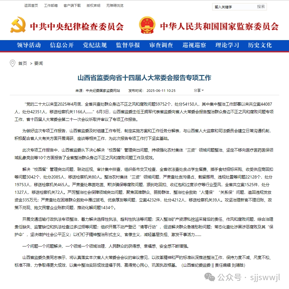 “黨的二十大以來至2025年4月底,全省共查處群眾身邊不正之風和腐敗問題59752個,處分54150人,其中集中整治工作部署以來共立案44087人,處分42351人,移送檢察機關1166人……”6月3日,山西省監(jiān)委主任王擁軍代表省監(jiān)委向省人大常委會報告整治群眾身邊不正之風和腐敗問題專項工作,省十四屆人大常委會第二十一次會議聽取并審議了專項工作報告。