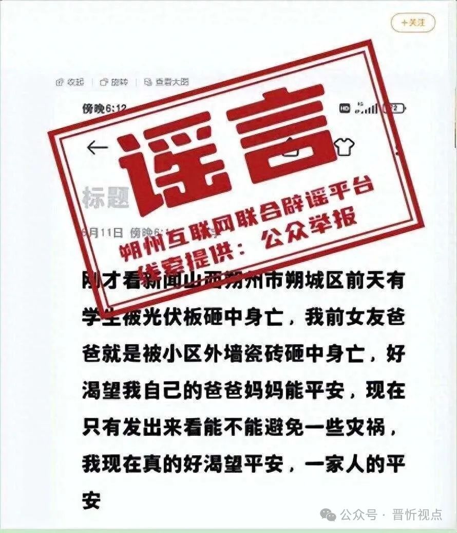 近日,網(wǎng)上出現(xiàn)“山西省朔州市朔城區(qū)有學(xué)生被光伏板砸中身亡”的消息,經(jīng)當(dāng)?shù)赜嘘P(guān)部門調(diào)查,該消息不實(shí),望廣大網(wǎng)民不聽、不信、不傳。