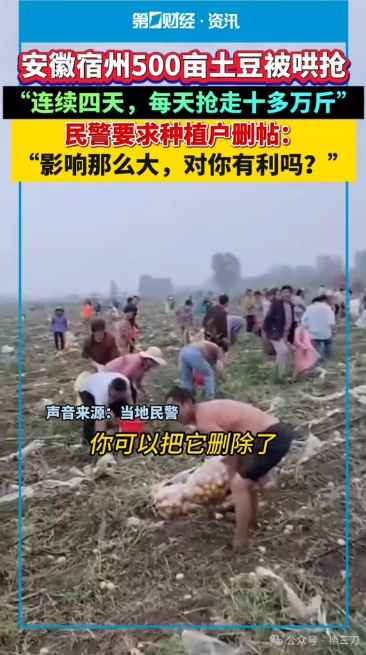 近日,安徽一種植戶的土豆遭村民哄搶,民警要求刪帖的新聞,引發(fā)了網(wǎng)友的廣泛關(guān)注。