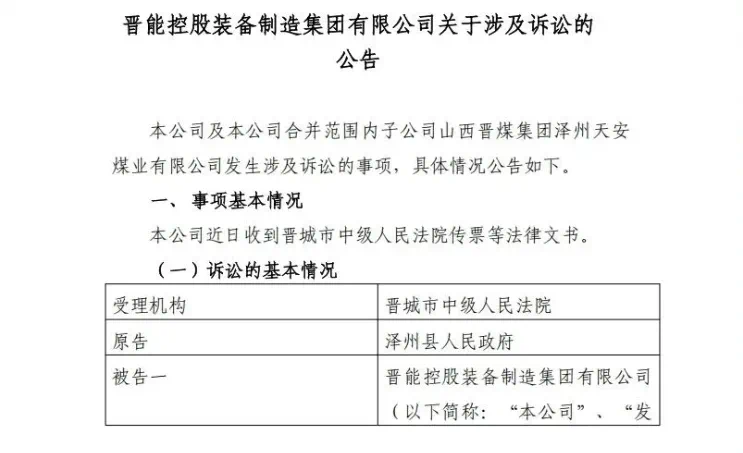 近日,晉能控股裝備制造集團有限公司公告,因與澤州縣人民政府的股權轉讓糾紛被起訴,涉案金額達25.186億元。案件源于2012年雙方簽訂的協(xié)議未完全履行,目前尚未開庭審理。