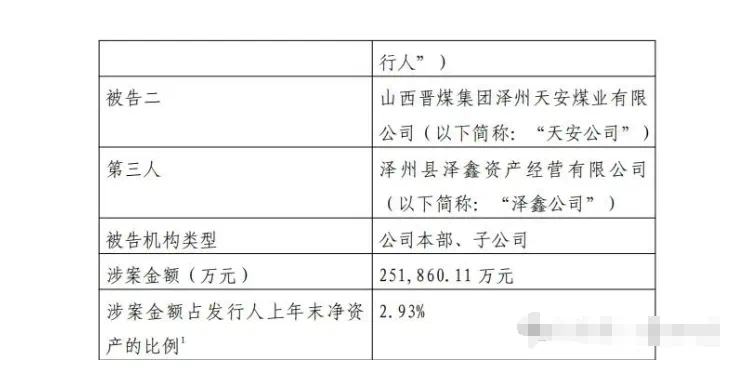 案件的基本情況(1)案由及訴訟標的:本案案由為股權轉讓糾紛,訴訟標的為2,518,601,148.43 元。 (2)訴訟請求及理由 訴訟請求:原告澤州縣政府訴求被告一繼續(xù)履行雙方于 2012 年 3 月 31 日簽訂《協(xié)議書》,判決被告二對上述款項承擔共同還款責任,本案訴訟費由二被告承擔。 事實與理由:山西省按照國務院下發(fā)的煤炭資源整合文件政策,確定發(fā)行人為晉城礦區(qū)的整合主體,與澤州縣政府授權的澤鑫公司于 2009 年 1月設立天安公司,用于整合澤州縣范圍內(nèi)的中小型煤礦,天安公司設立時 發(fā)行人持股 51%、澤鑫公司持股 49%。2012 年 3 月 31 日,發(fā)行人擬向天安 公司增資,經(jīng)協(xié)商后澤州縣政府與發(fā)行人及澤鑫公司簽訂《協(xié)議書》。協(xié)議約定:“從 2012 年 1 月 1 日起,以天安公司所整合礦井的產(chǎn)能按噸核定資 金,由天安公司負責支付給澤州縣財政局,用于保障縣鄉(xiāng)兩級政府既得利益的支出,發(fā)行人負責監(jiān)督保障。同時澤州縣政府放棄天安公司的分紅權利,天安公司稅后可分配利潤全部由發(fā)行人享有?!鼻笆鰠f(xié)議履行期間,因政策等原因,天安公司未持續(xù)按協(xié)議約定向澤州縣財政局支付款項。▌來源:與煤同行、世界晉商網(wǎng)、山西資本圈等綜合